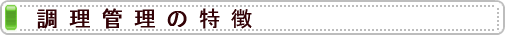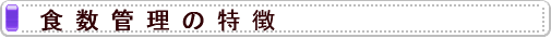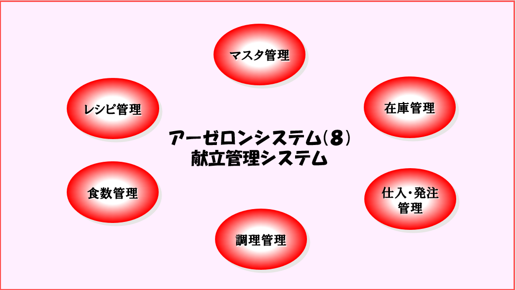 ①マスタ管理(会社組織図で事業所管理)②レシピ管理③食数管理④調理管理⑤発注・仕入・買掛管理⑥消費・賞味期限管理⑦入荷・在庫管理とロケーション管理⑧トレーサビリティシステム対応⑨献立シミュレーション&献立分析
