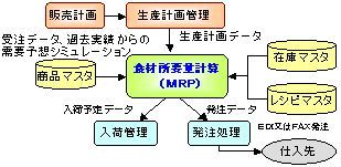 - 販売計画(需要予測)データと過去生産実績データと在庫データから生産計画表(生産シミュレーション)を作成します。MRP(資材所要量計算)機能により製造計画を自動作成しますと、製造指示データと食材と包材の発注データが作成されます。